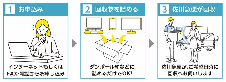 市の連携・協力事業者であるリネットジャパンリサイクル株式会社が、宅配便による回収を行っています。回収品目にパソコン本体が含まれている場合、1箱分の回収料金が無料となります(無料となる上限は、3辺合計140cm以内、重量20kg以下)。プリンターなどの周辺機器も一緒に回収できます。個人情報のデータ消去サービスもあります(有料)。