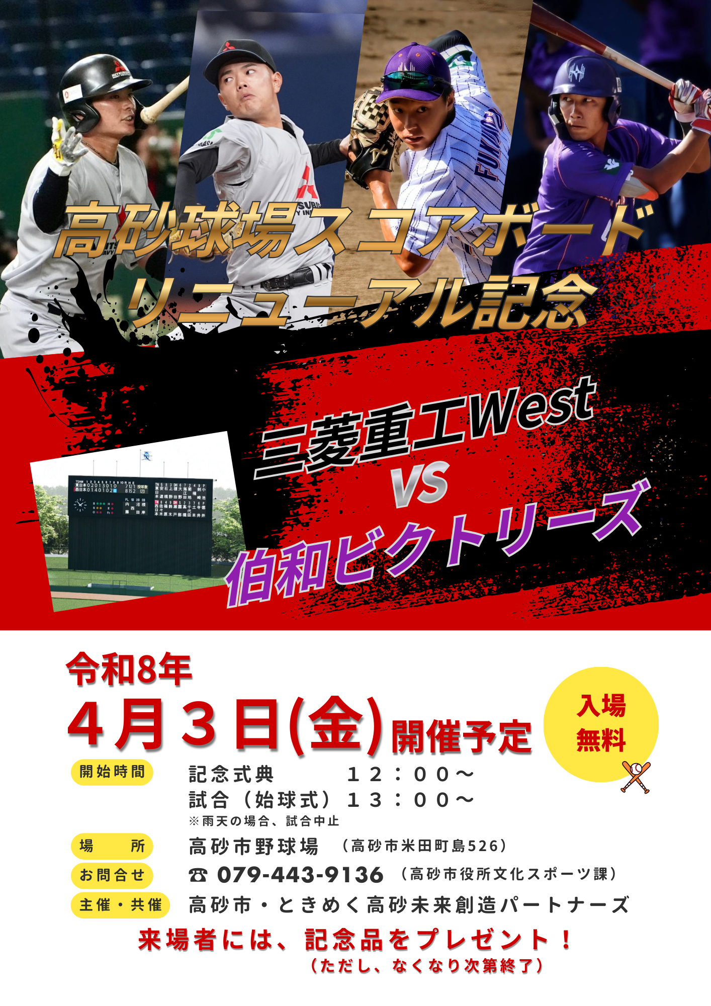 高砂球場のスコアボードリニューアルを記念して式典・記念試合を開催します!