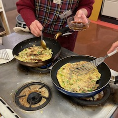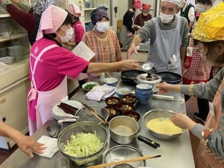 じゃがいもの皮をむいたり、玉子を溶いたり、みんなで分担し、協力し合いながら料理準備を進めれました。