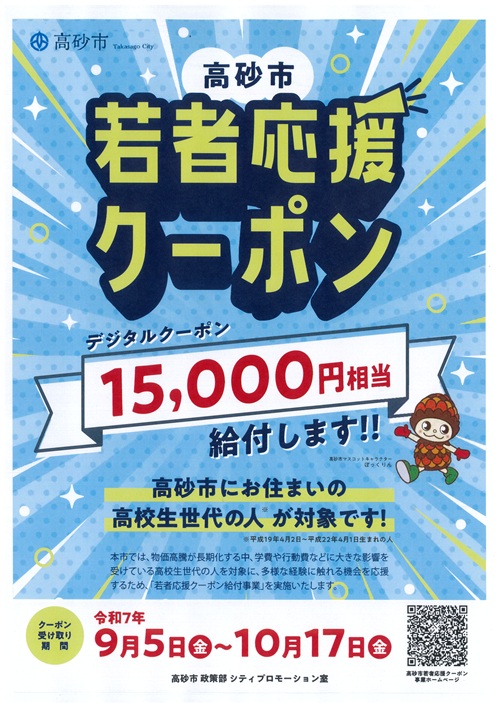 高砂市では、物価高騰が長期化する中、学費や行動費等に影響を受けている高校生世代の方を対象に、物価高騰の影響により制限されている多様な経験に触れる機会を応援するため、15,000円相当のデジタルクーポンを給付します。