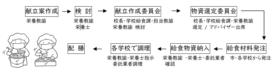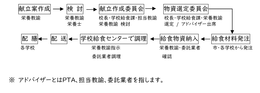 単独校方式:学校の給食室で調理し、提供する方式 親子方式 :親である小学校の給食室で調理し、専用の配送車で提供する方式 共同調理場方式:給食センターで複数の学校を対象に調理し、専用の配送車で各学校に提供する方式 |