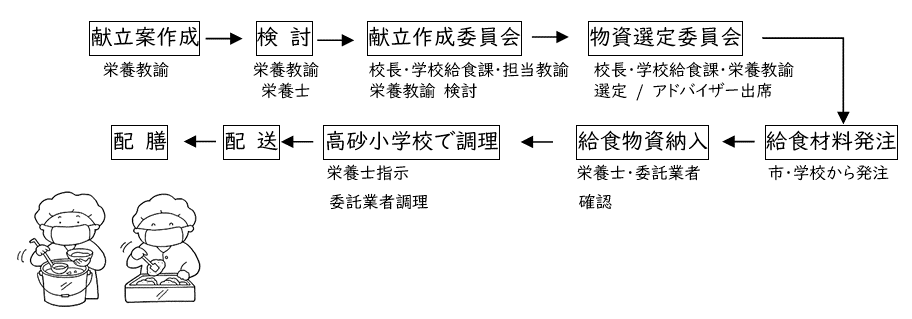 小学校は単独校方式、高砂中学校は高砂小学校で調理する親子方式、高砂中学校以外の中学校は共同調理場方式で実施しています。