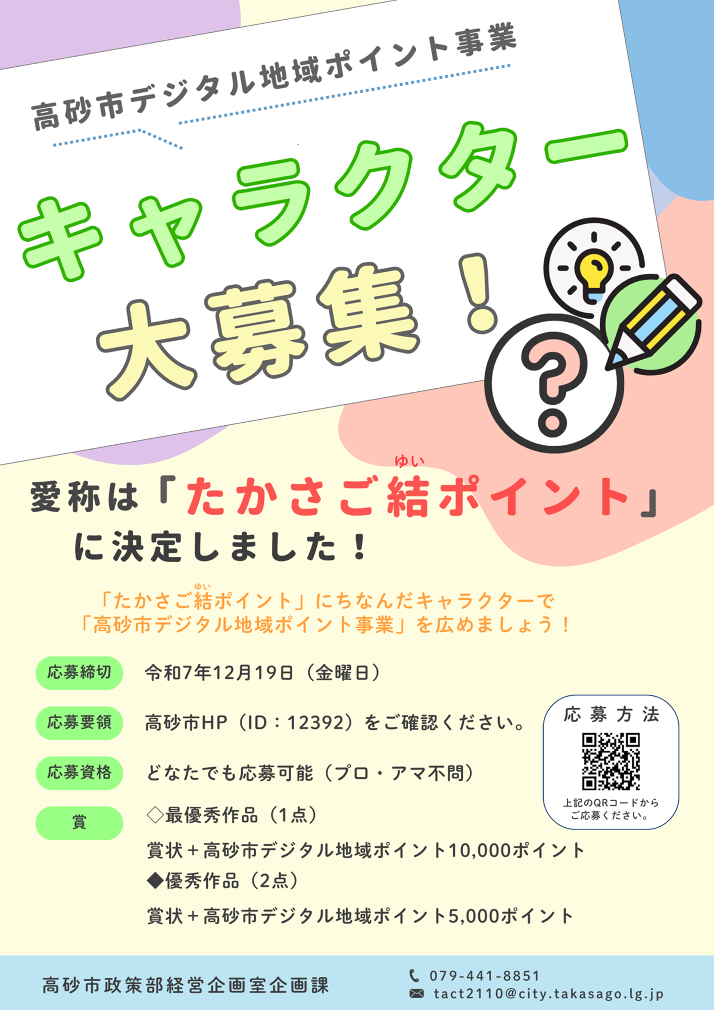 ※採用作品の著作権、その他一切の権利(商標・意匠の出願および登録をする権利)は、すべて高砂市に帰属する。