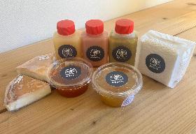 高御位山の麓で四季折々にすくすくと育った野菜や果実を使用したドレッシングやジャム、チーズケーキのほか、農菓みきやが大切に育てたお米を詰め合わせました。