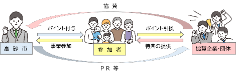 協賛いただいた事業者の皆さまの高砂市デジタル地域ポイント事業を用いた社会的な活動や取り組みを広報し、社会貢献度やイメージ向上につなげます。(ご協賛いただく内容によって特典は異なります。)