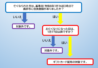 プリペイド型ギフトカード配布事業の対象者は令和8年1月16日時点で高砂市住民基本台帳に記載されている方になります。