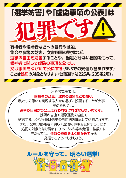 - 公職の候補者は、その責任を自覚し、ポスター掲示場に掲示するポスターには、他人若しくは他の政党等の名誉を傷つけたり、善良な風俗を害したり、特定の商品の広告その他営業に関する宣伝をする等、品位を損なう内容を記載してはならないこと。