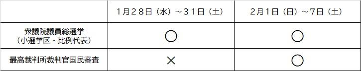 このため、1月28日(水曜日)から1月31日(土曜日)までの間は衆議院議員総選挙のみで、最高裁判所裁判官国民審査の期日前投票はできません。