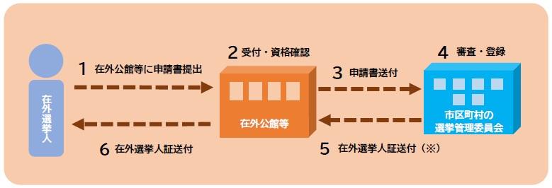 ※在外選挙人証の交付の迅速化の観点から、令和6年7月19日より、市区町村の選挙管理委員会から在外公館等に送付された在外選挙人証データを在外公館が印刷して交付する方法に変更となります。