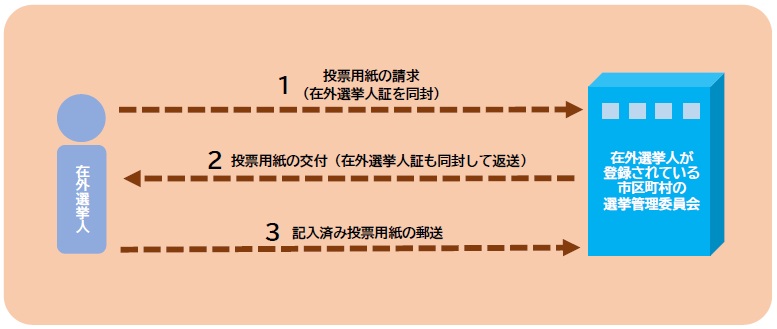郵便によって在外選挙人名簿に登録されている市区町村の選挙管理委員会に投票用紙を請求し、自宅等で送られた投票用紙に記入の上、当該選挙管理委員会へ郵送することによって投票する方法です。