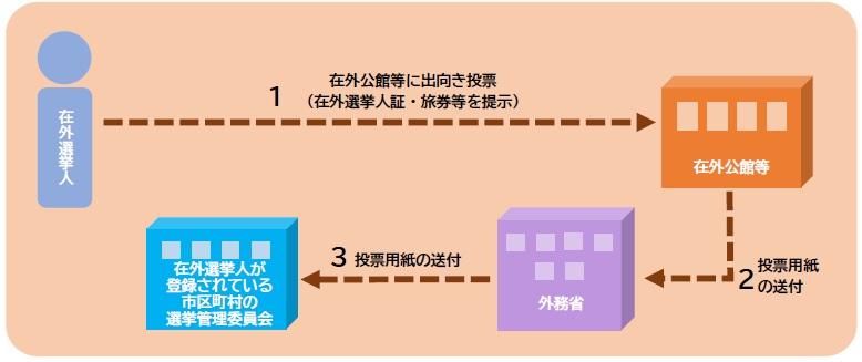 管轄の大使館、領事館等に直接出向き、投票する方法です。
